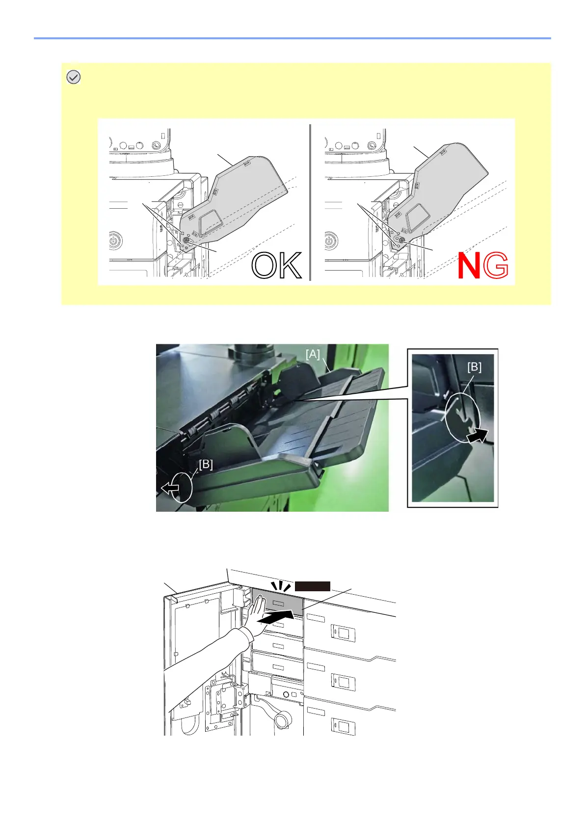 Attach the exit tray [A] to the main unit hooking up two (front and rear) hooks [B] of