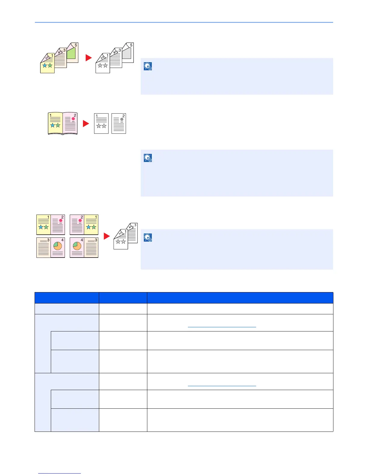 Prints 1-sided or open book originals to 2-sided, or 2-sided or open book originals to 1-sided. Select the binding