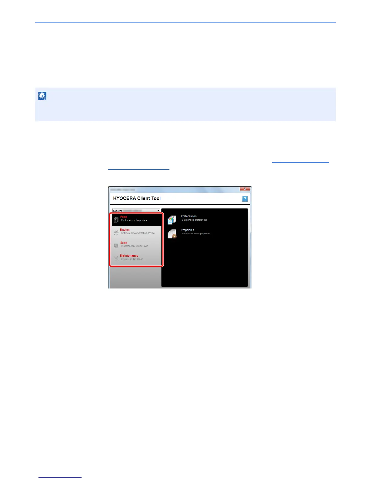 • For the detailed functions of KYOCERA Client Tool, refer to KYOCERA Client Tool User Guide.