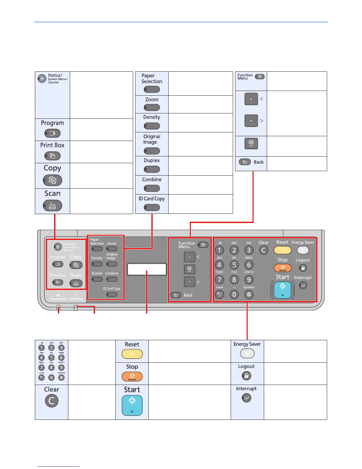 Displays the setting menu, machine status,