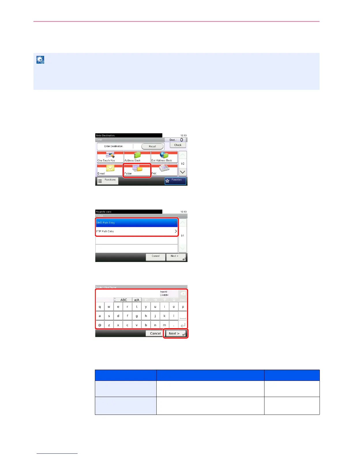 Specify either the desired shared folder on a computer or an FTP server as the destination.