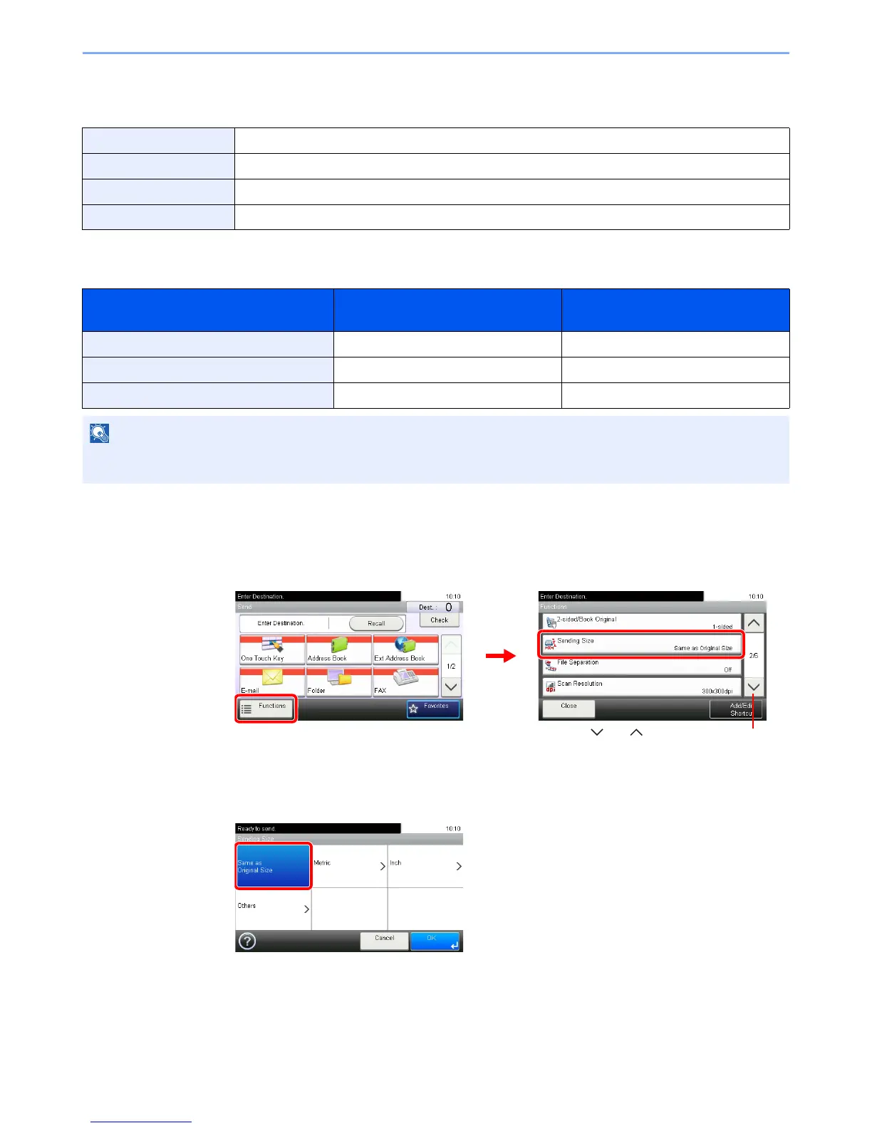 Original Size (page 3-31), Sending Size, and Zoom (page 3-55) are related to each other. Refer to the following table.