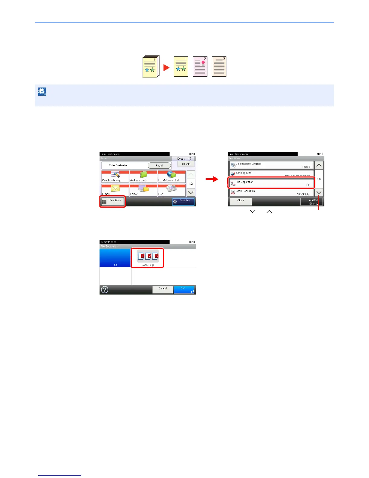 Create several files by dividing scanned original data page by page, and send the files.