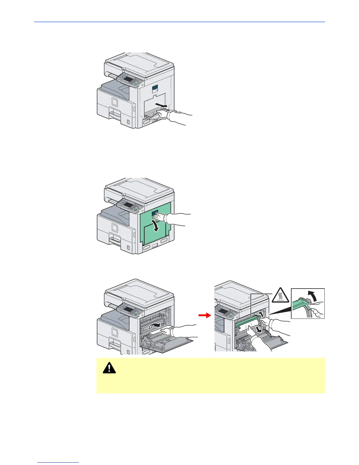 The fixing unit is extremely hot. Take sufficient care when working in this area, as