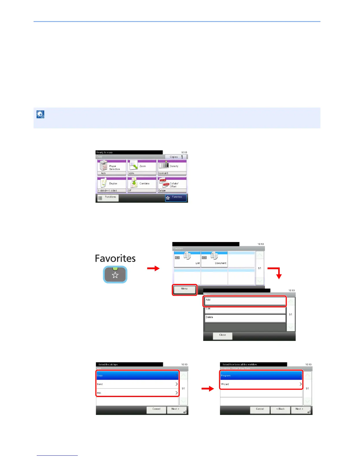 When registering favorites in program mode, configure the copy function, send function, fax