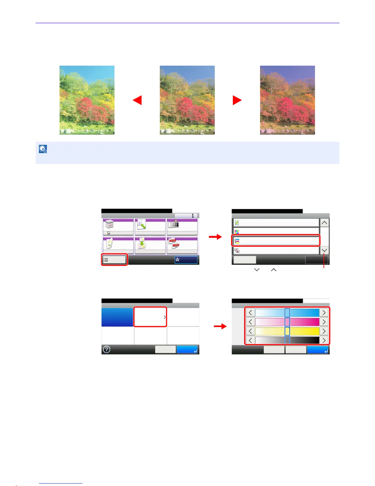 Press [<] or [>] on each side of the color to be adjusted (Cyan, Magenta, Yellow, Black) to