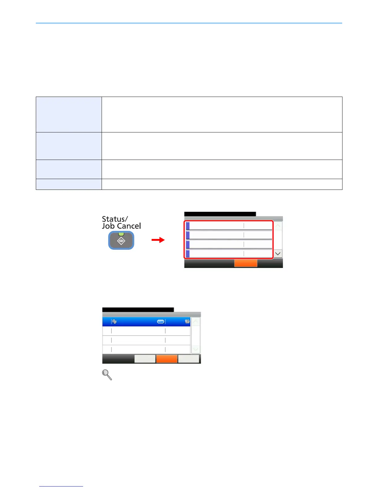 Refer to Print Job Status Screen on page 8-3, Send Job Status screen on page 8-4, Store Job