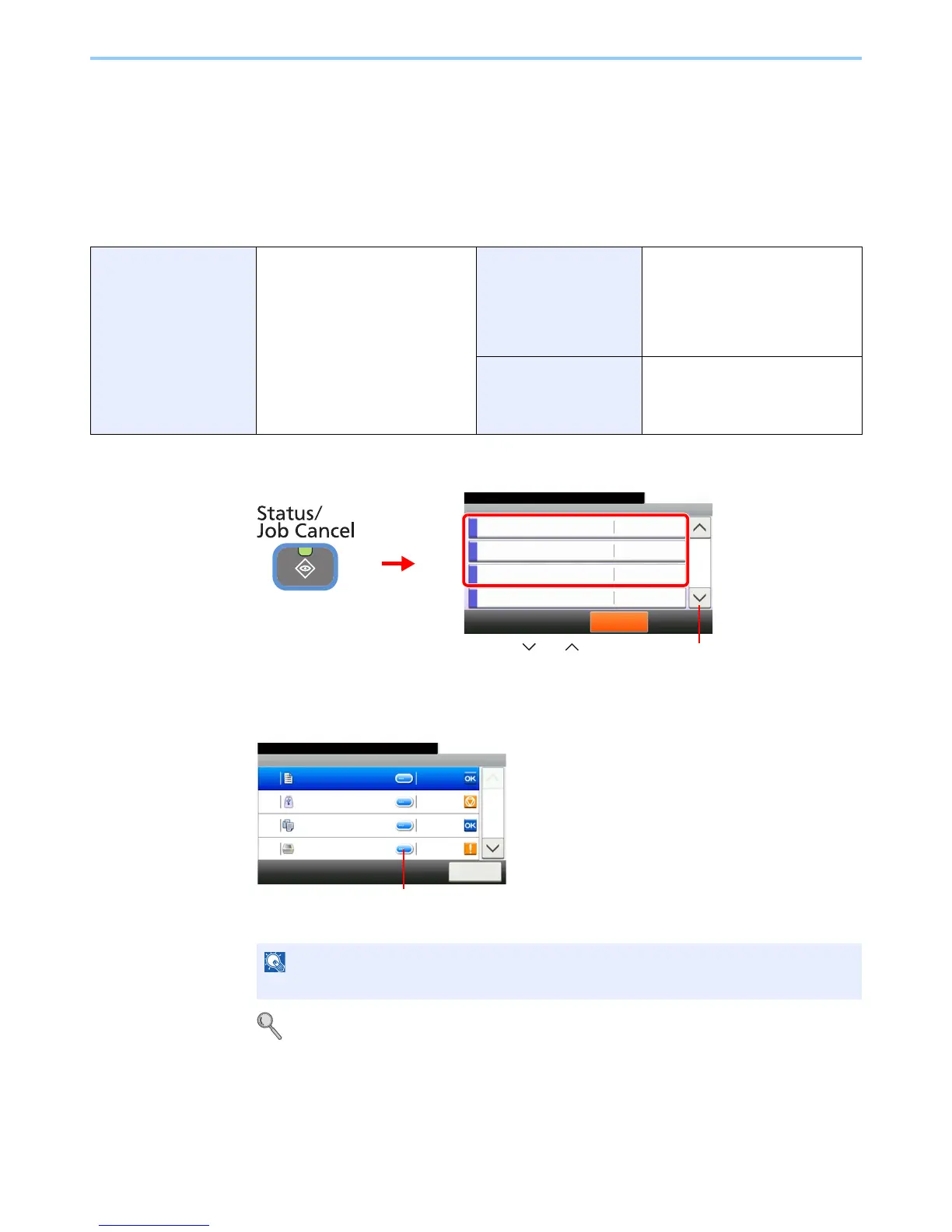 The job histories are displayed separately in three screens - Printing Jobs, Sending Jobs, and Storing Jobs. The