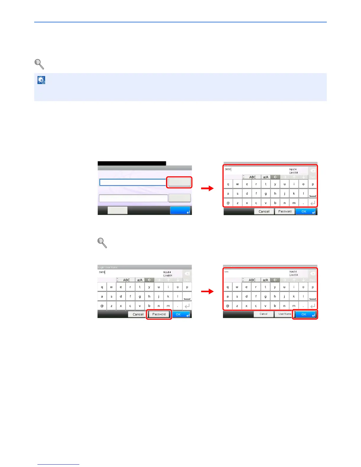 If user login administration is enabled, it is necessary to enter the login user name and password to use the machine.