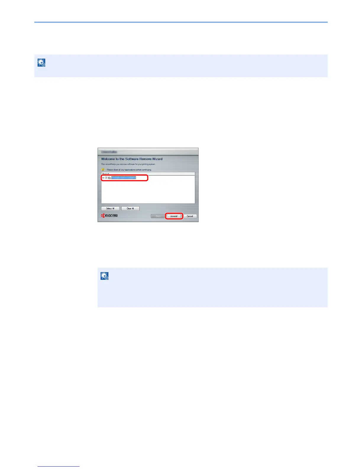 and [Uninstall Kyocera Product Library] to display the Uninstall Wizard.