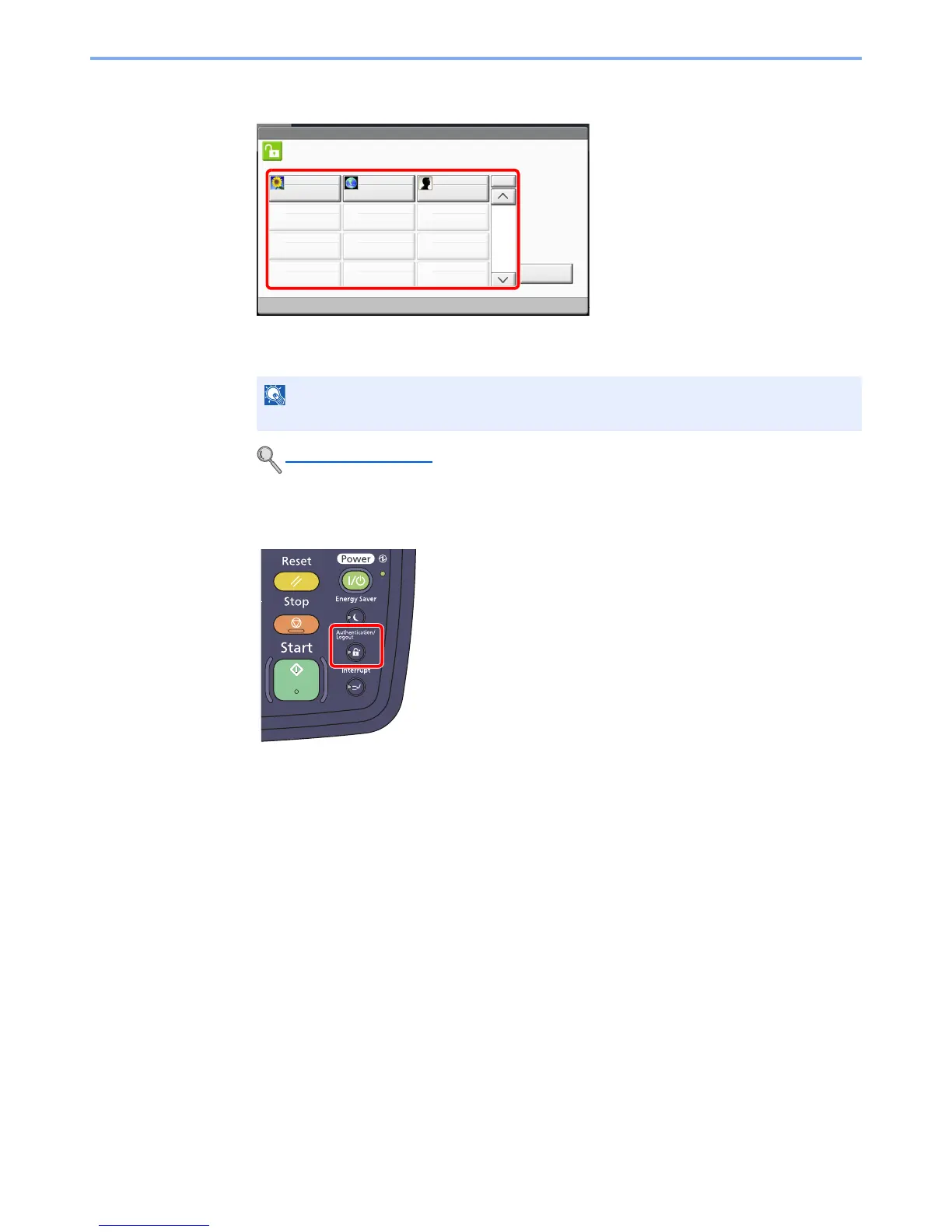 To logout from the machine, press the [Authentication/Logout] key to return to the login user