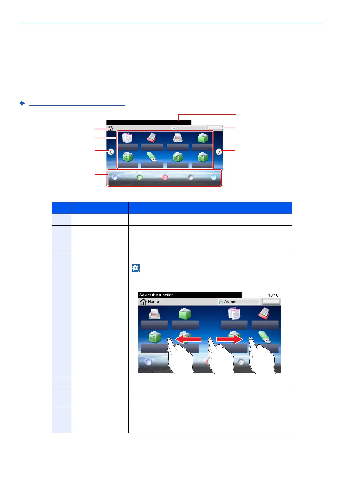 This screen is displayed by selecting the [Home] key on the operation panel. Touching an icon will display the