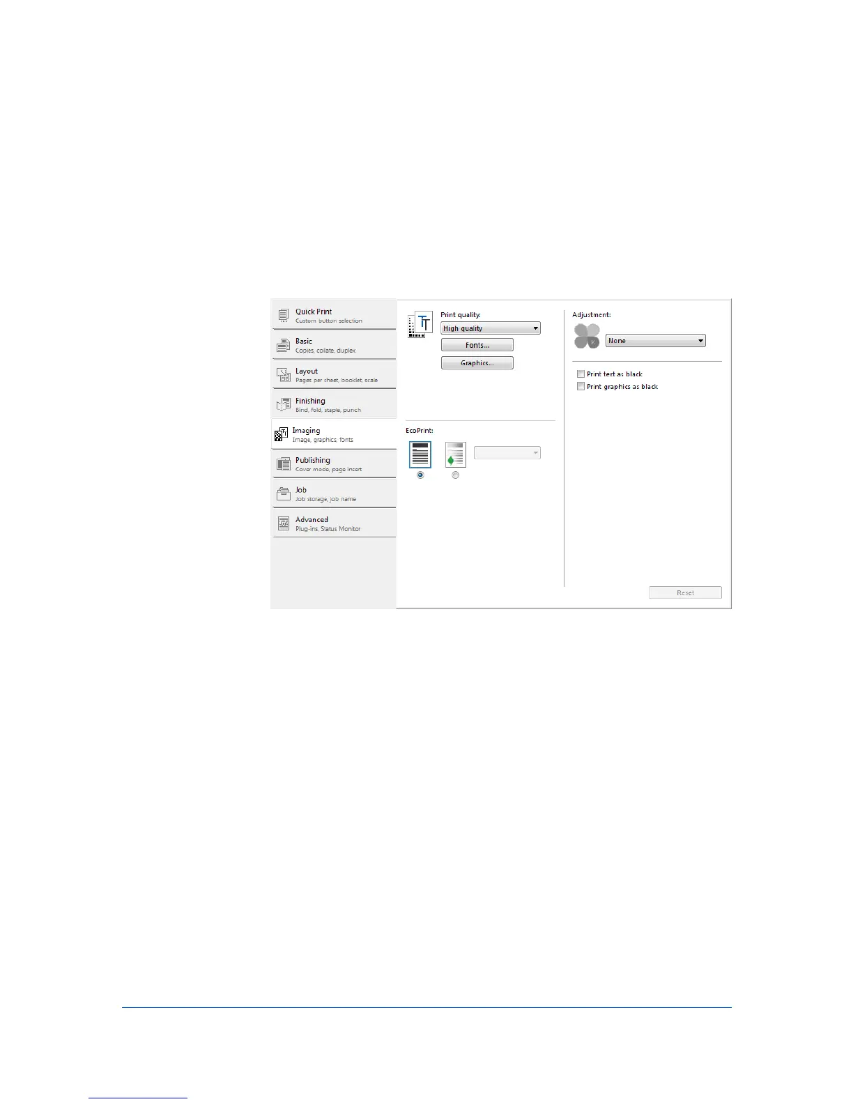 In the Imaging tab, you can manage print quality and grayscale settings.