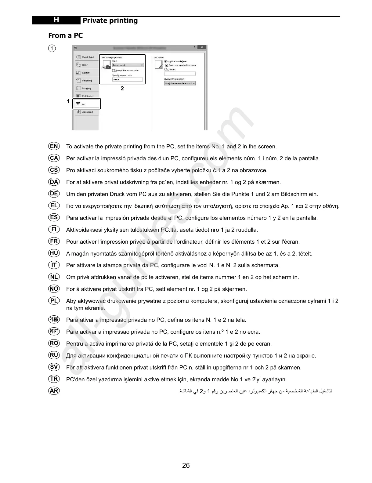 Για να ενεργοποιήσετε την ιδιωτική εκτύπωση από τον υπολογιστή, ορίστε τα στοιχεία Αρ. 1 και 2 στην οθόνη.