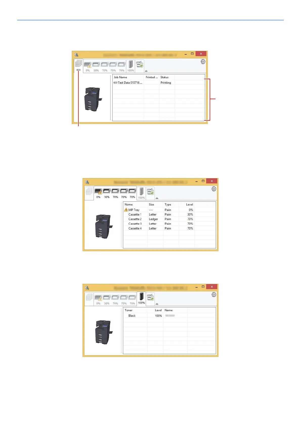 Kyocera TASKalfa 4012i - Printing Progress Tab; Paper Tray Status Tab; Toner Status Tab