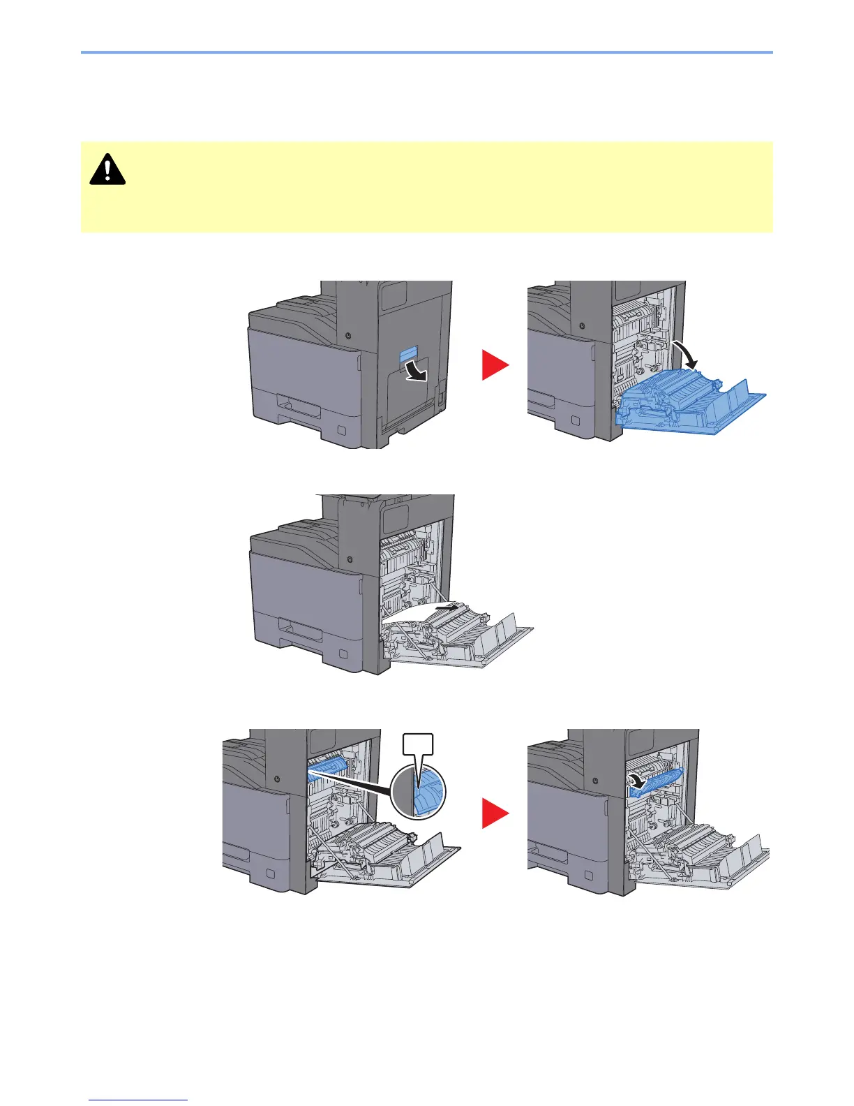The fixing unit is extremely hot. Take sufficient care when working in this area, as there is a danger of getting