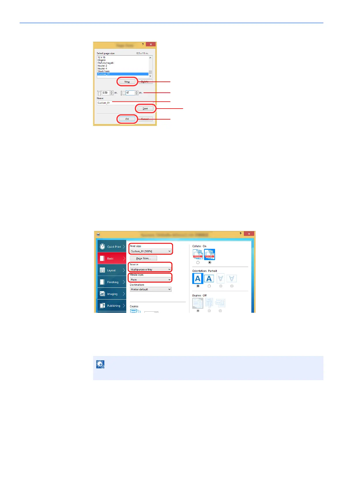 2 Enter the length (470.1 mm (18.51") or longer), and width of the custom paper size being