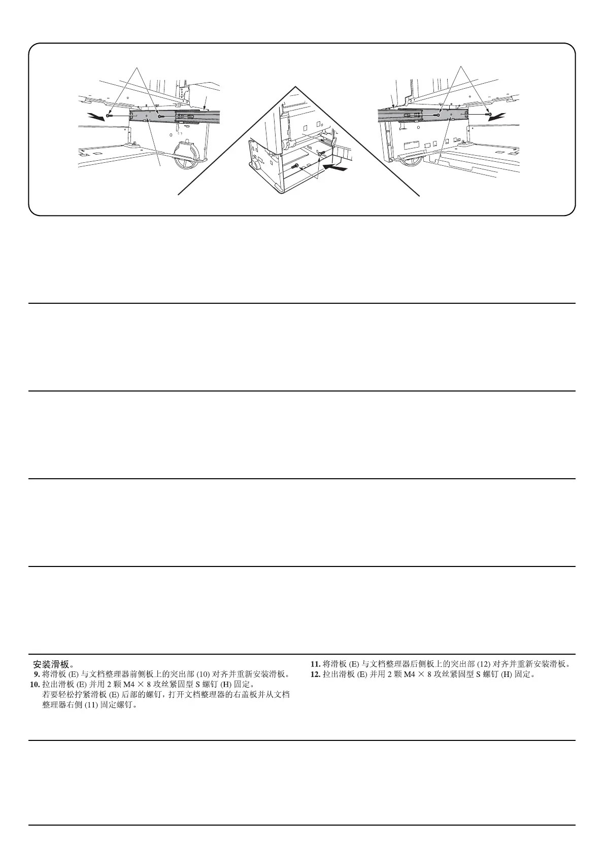 12.Pull out slider (E) and secure it with two M4 × 8 tap-tight S screws (H).