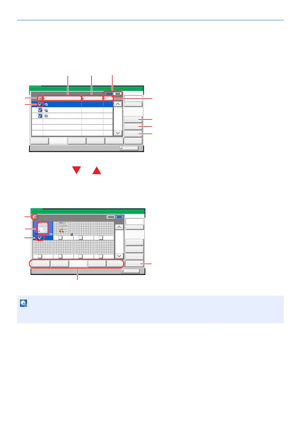 The document list is a list of the documents stored in the custom box. Documents can be listed either by name or as