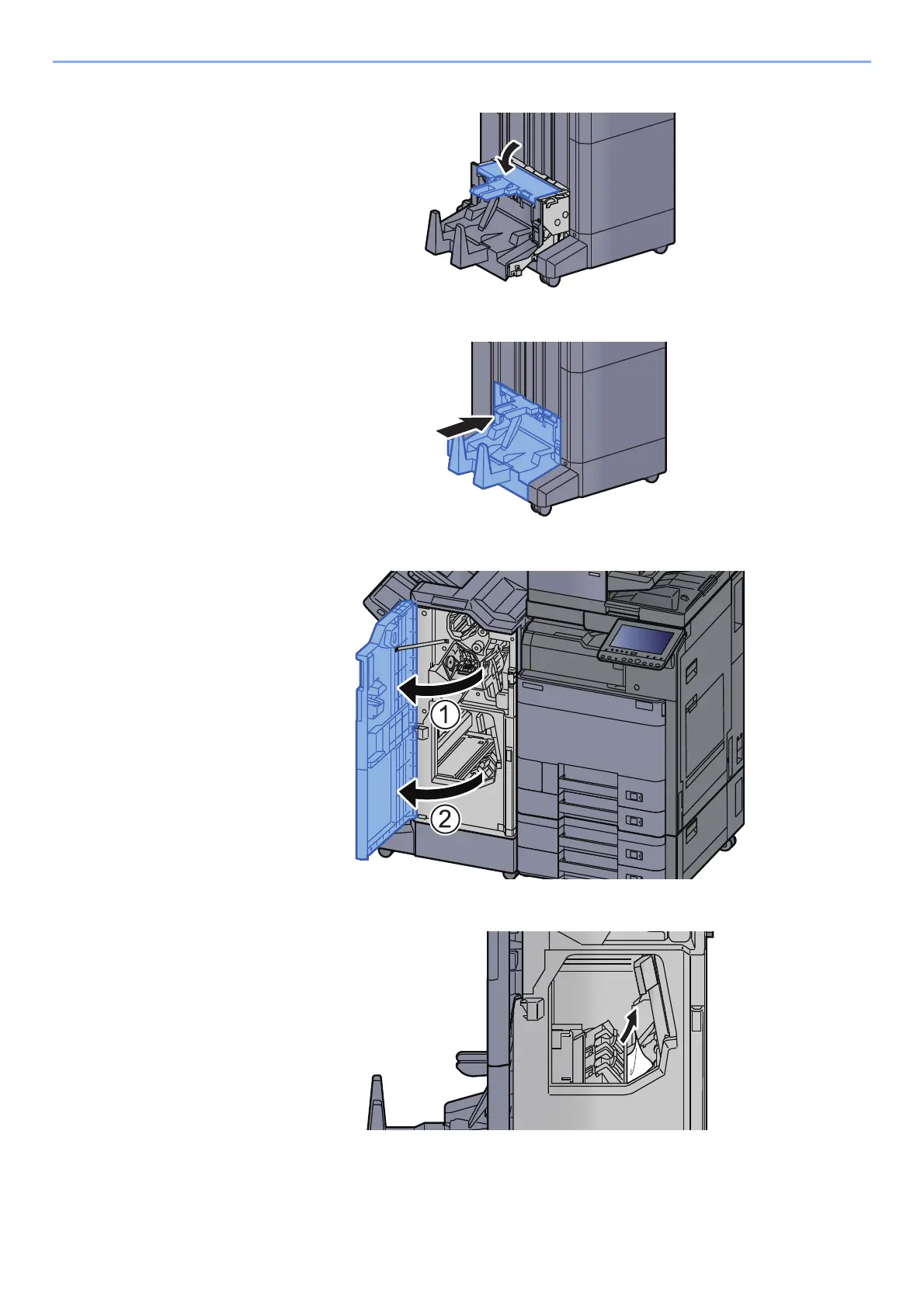 Open the finisher front cover 1 and 2.