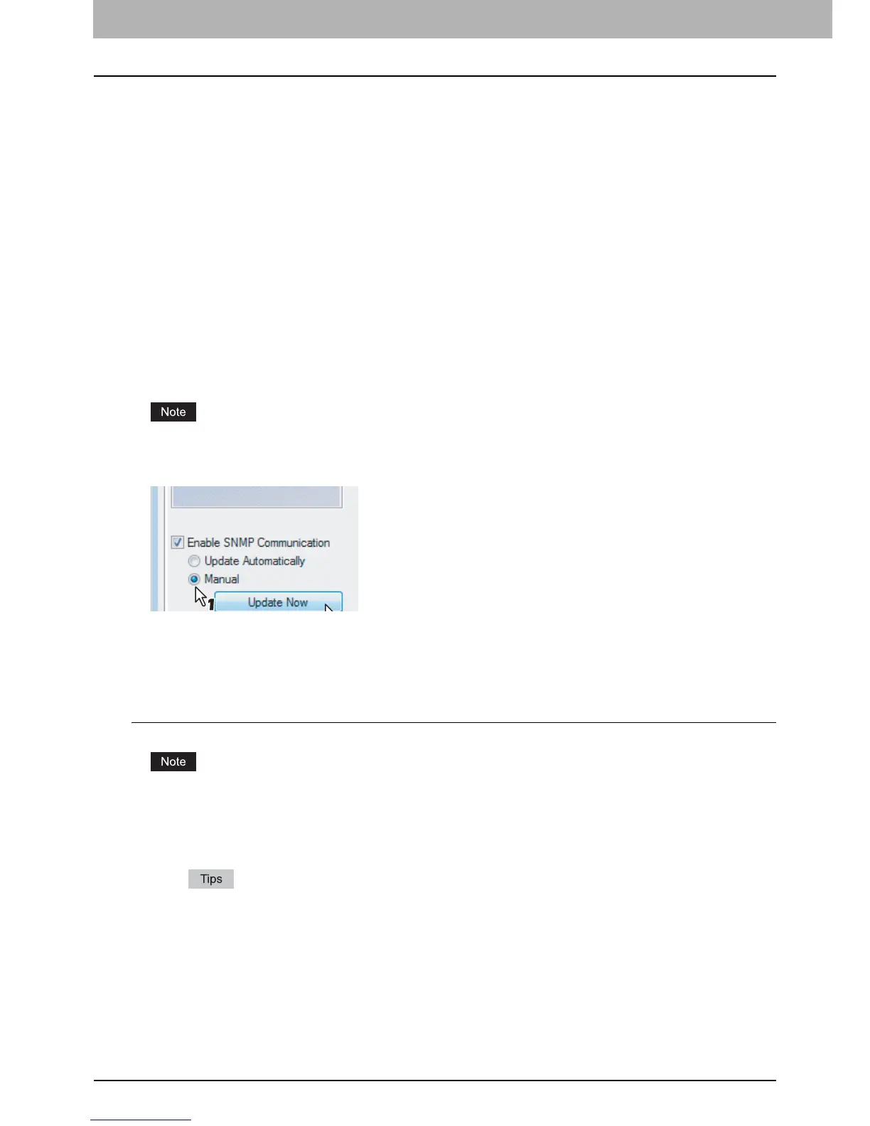 If available, select [Manual] of [Enable SNMP Communication] check box on the [Configuration] tab menu, and then