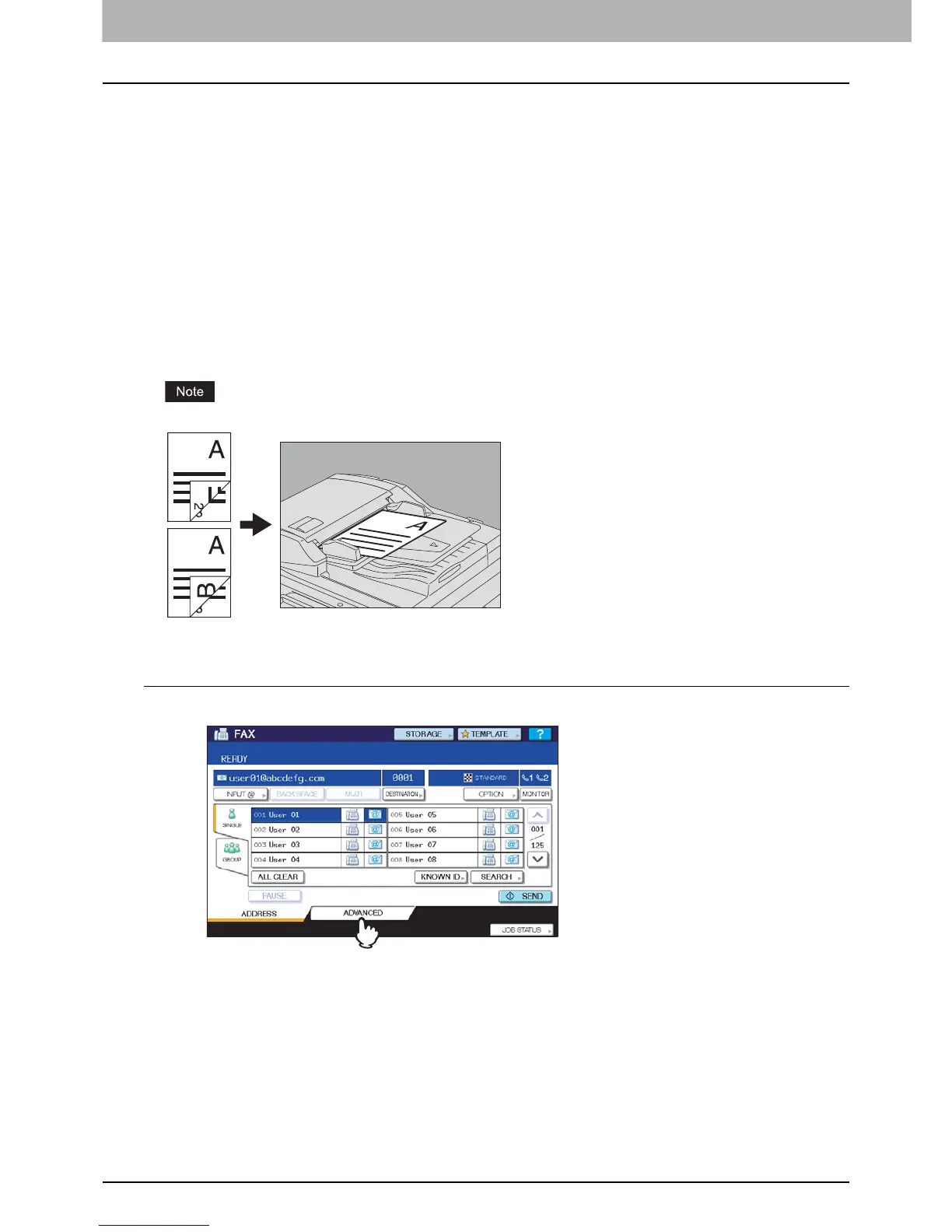 Pressing [ADVANCED] during the Internet faxing operation displays the [ADVANCED] tab. On this tab, the following