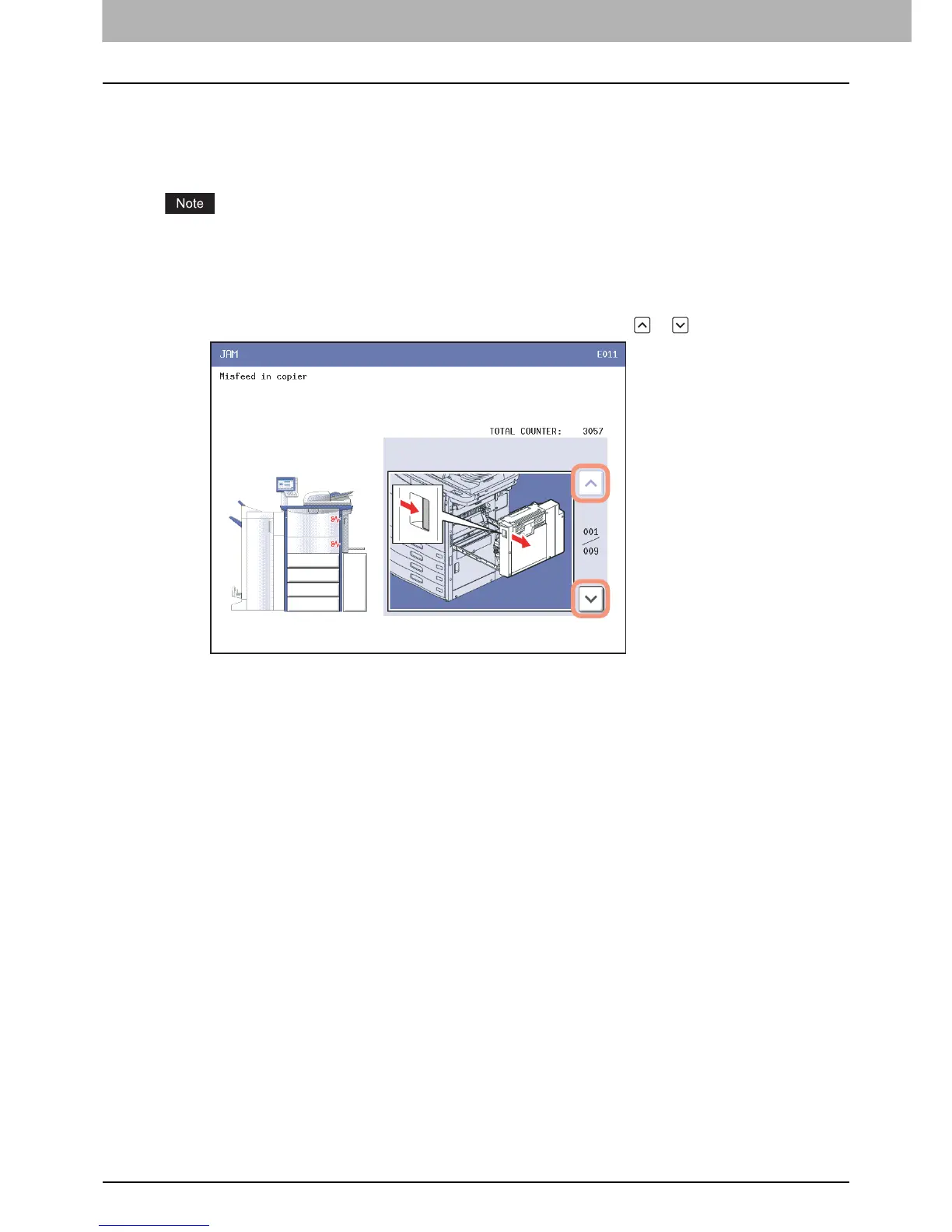 Clear the paper jam following the guidance shown on the touch panel. Press or to scroll the pages.