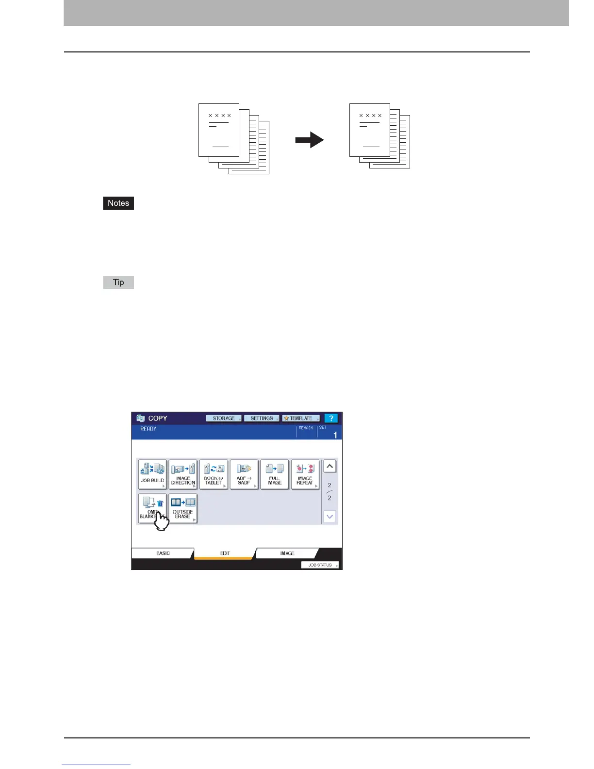 You can remove blank sheets included in the scanned originals before copying is started. This function is called “omit