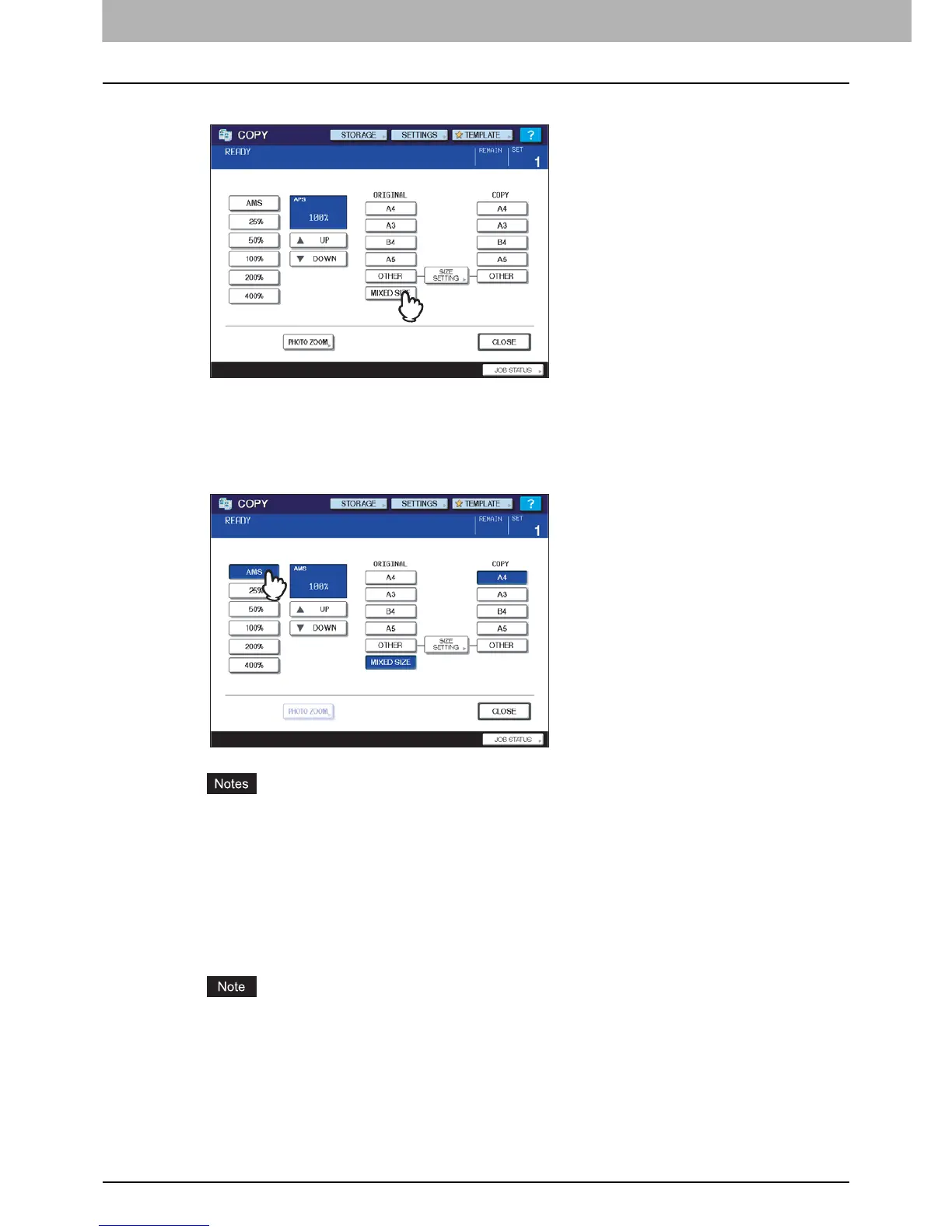 Press [AMS] to make copies on paper in one size. To make copies on paper of the same