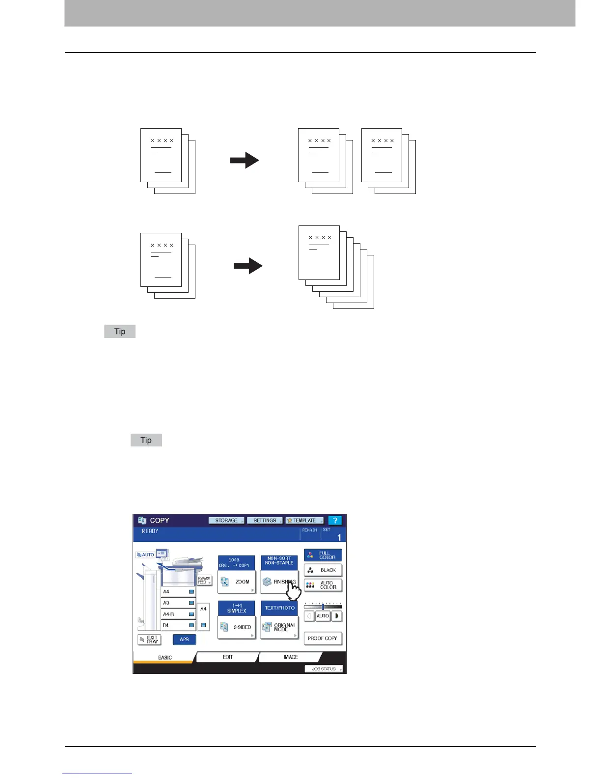 This mode is called the sort mode. Copies can also be made to exit grouped by page. This mode is called the group mode.