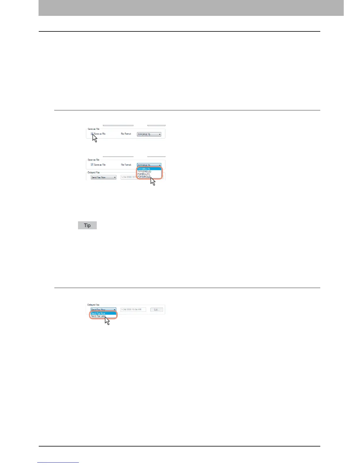 Display the [Send] tab and select [Send Fax Later] in the [Delayed Fax] drop down box.