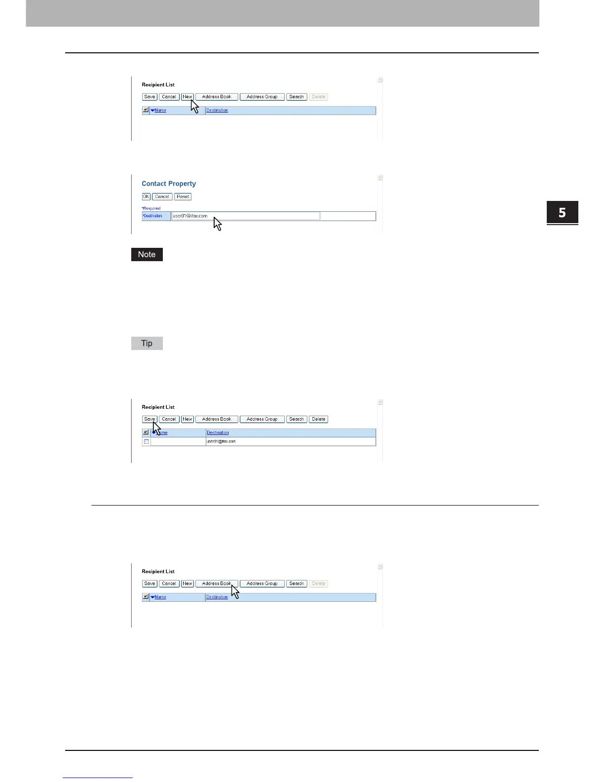 Enter the email address or fax number of the recipient, in the [Destination] box.