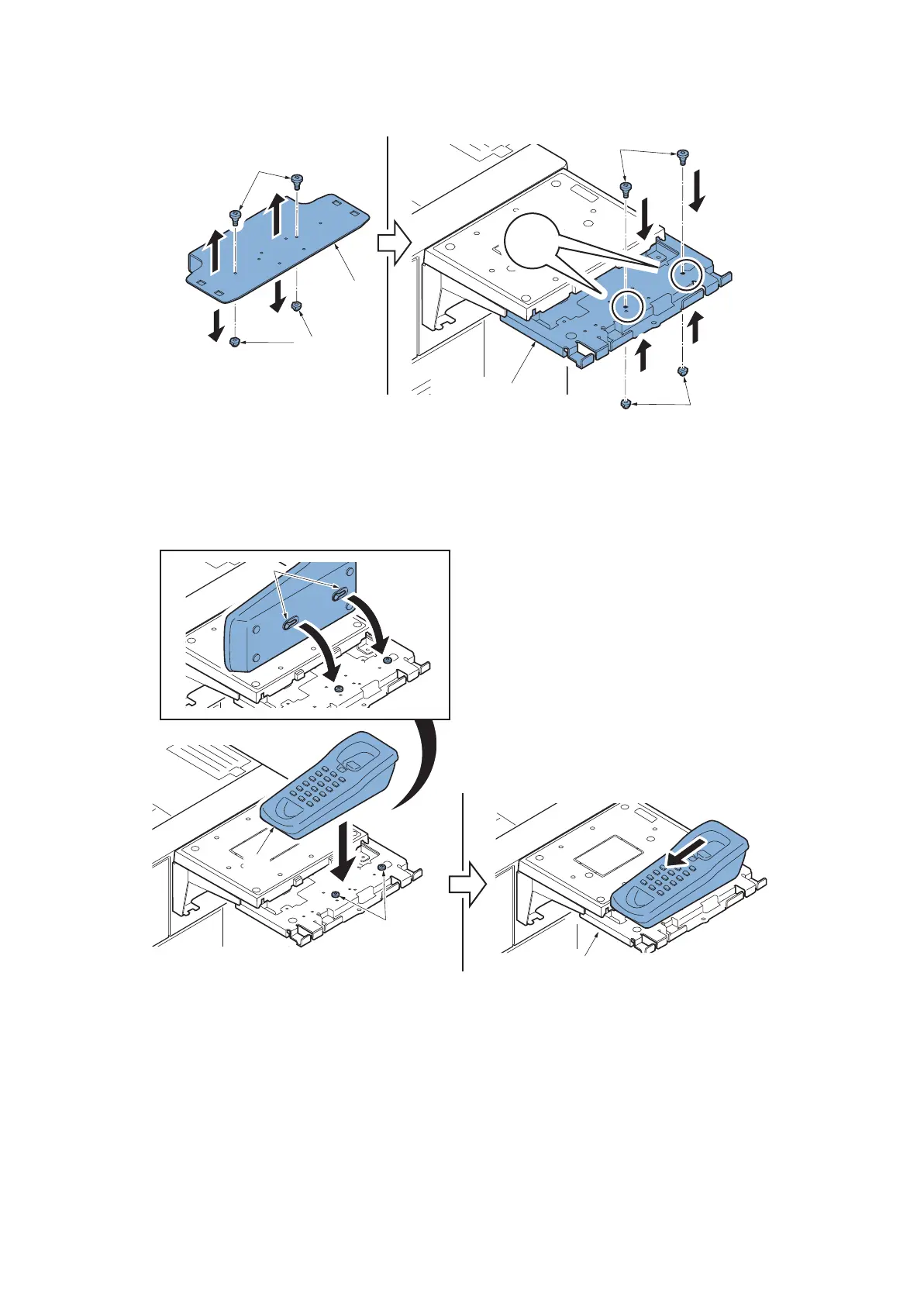 17. Remove two pins (b) and two nuts (c) from the handset mounting plate (a).