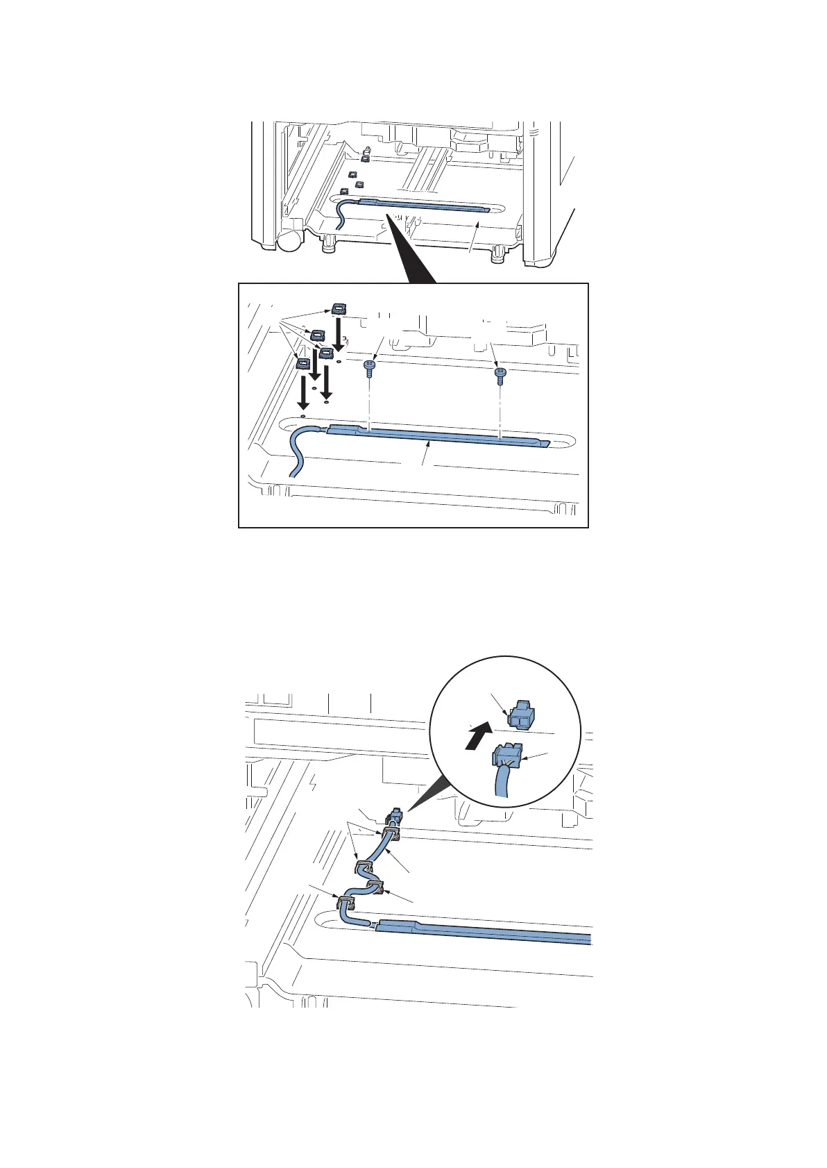 8. Pass through the cassette heater wire (a) in four wire saddles (b).