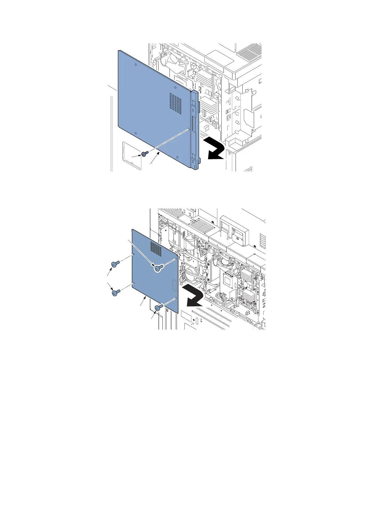 5. Remove four screws (a)(M3x8) and the detach right rear cover (b) in the direction of the arrow.
