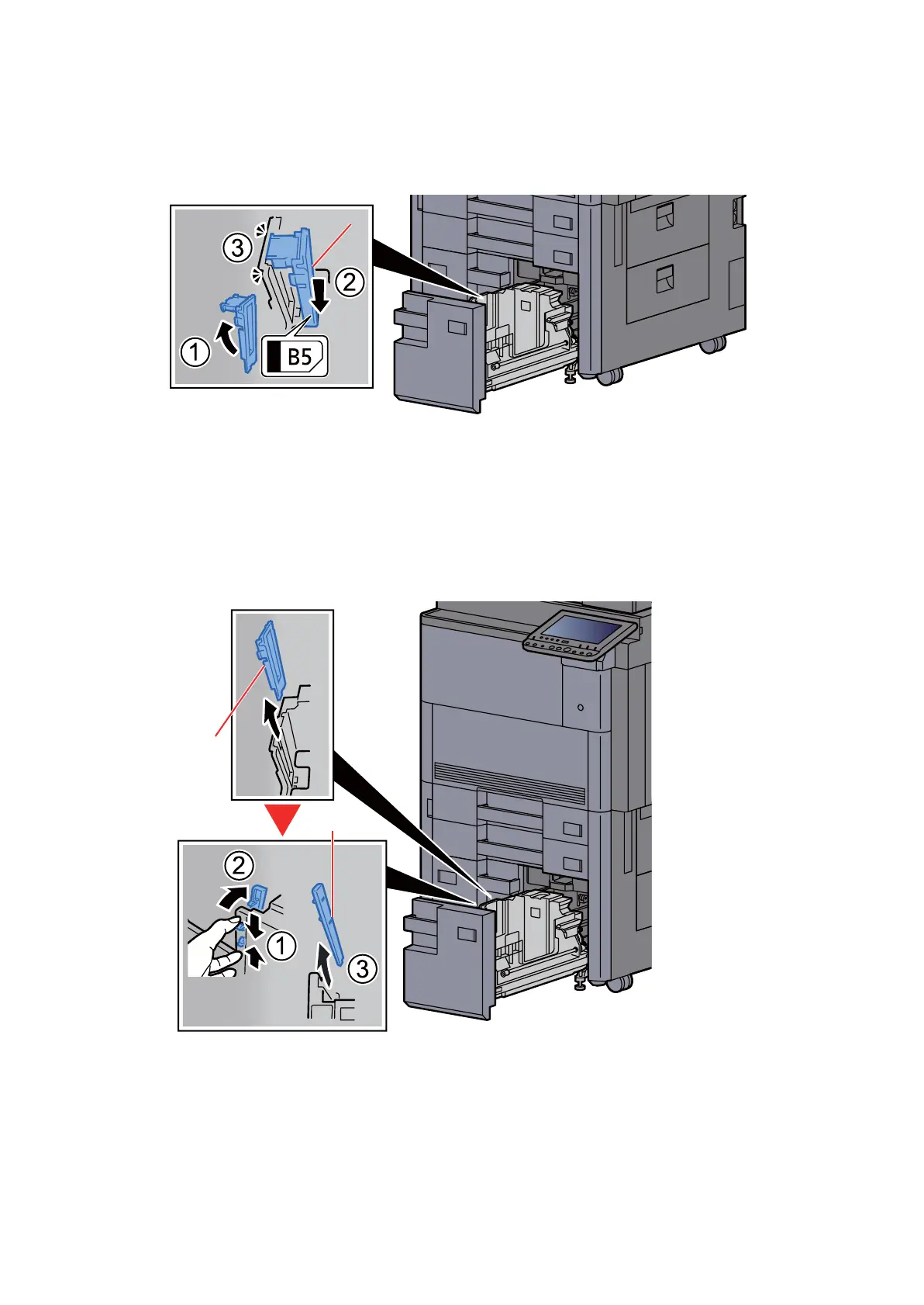Open the paper size guide B(c) as shown the diagram, insert the B5 marking groove(the bottom of the tray) and then