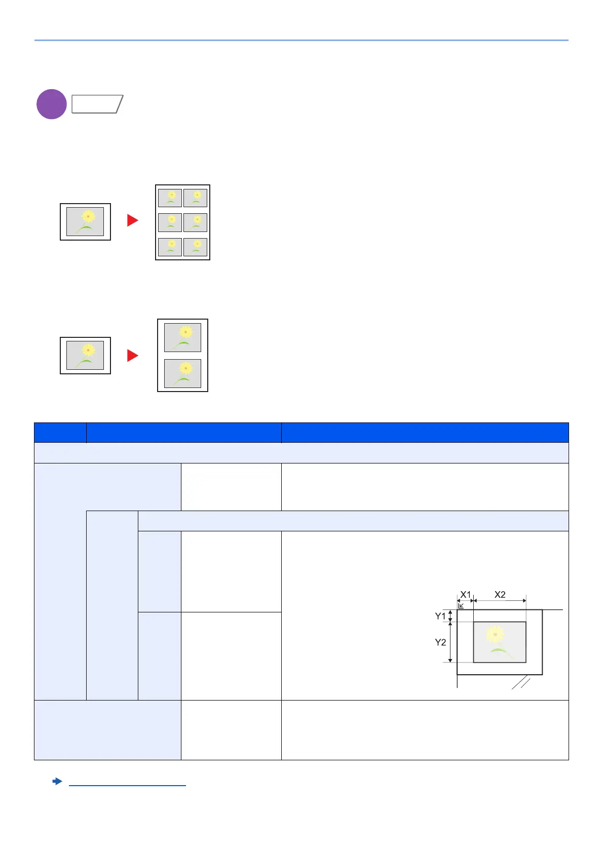 Tiles the 1 copied sheet with an original image. You can also specify the area of the original to repeat.