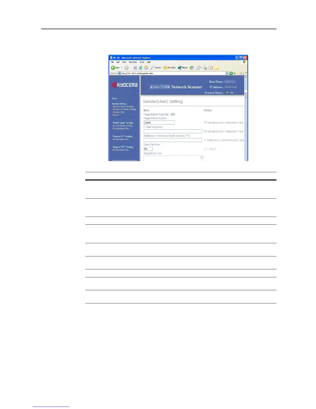 shown in the Sender Registration table and on the scanner device operation