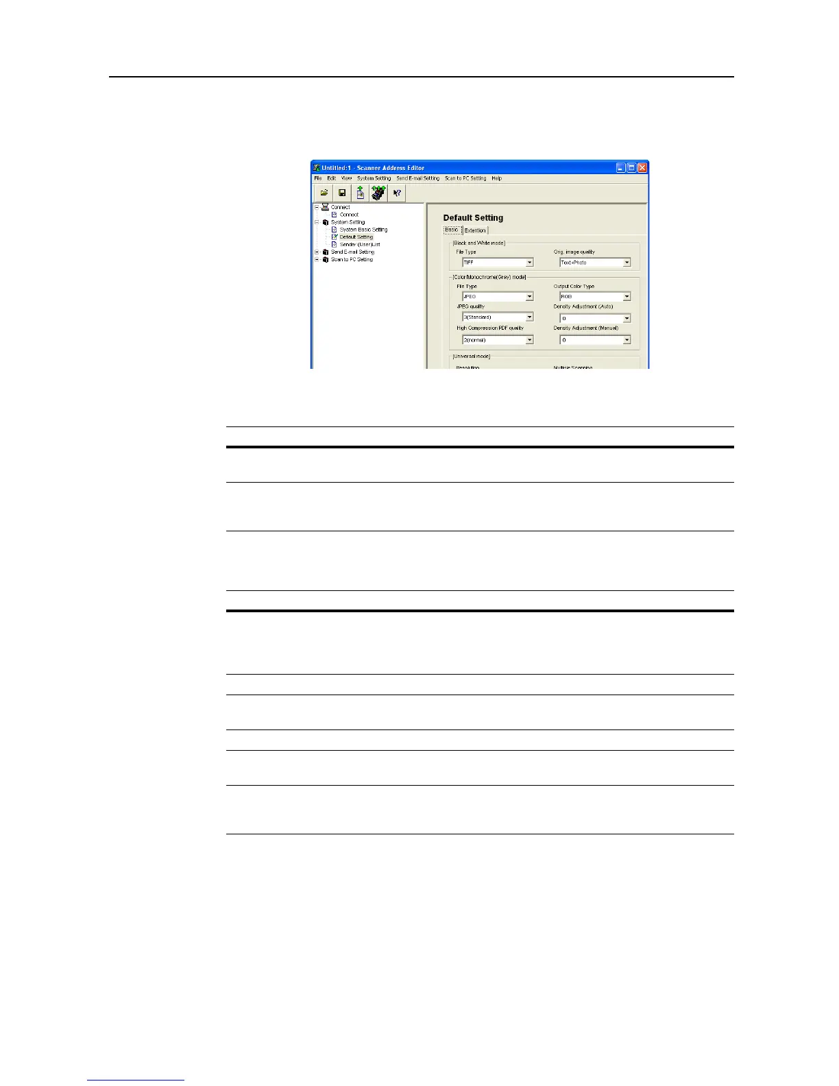 Configure image scanning related default settings for the scanner. The settings items are Basic