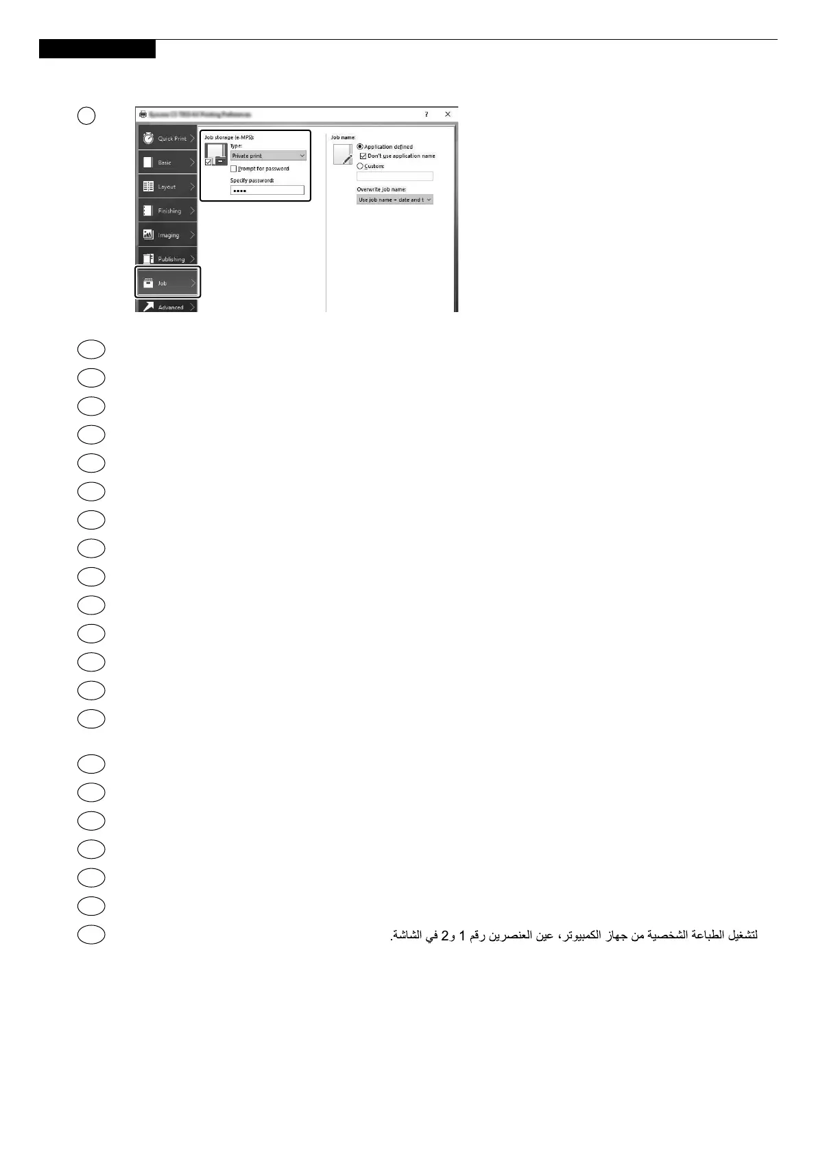 Aby aktywować drukowanie prywatne z poziomu komputera, skonfiguruj ustawienia oznaczone cyframi 1 i 2