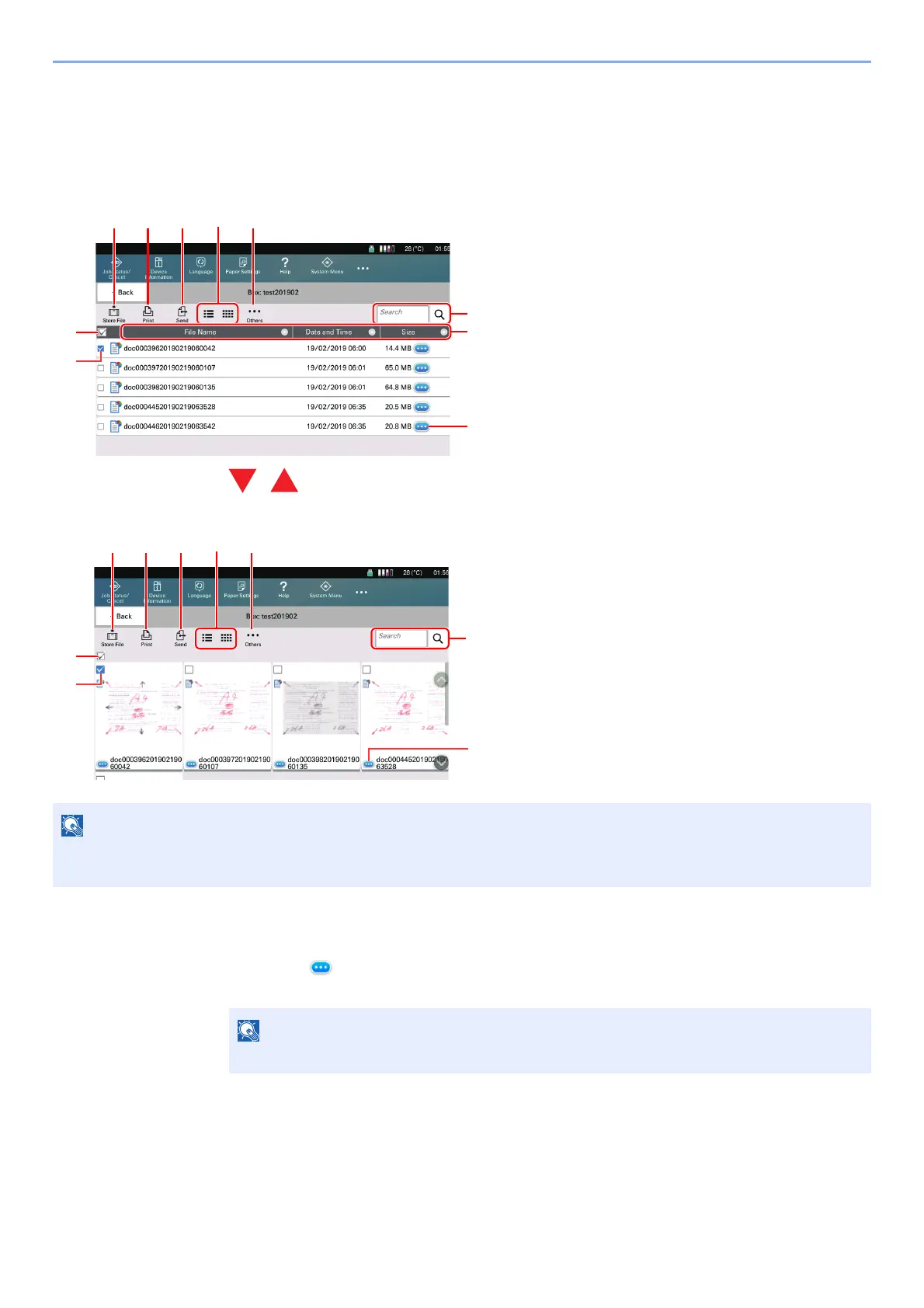 The document list is a list of the documents stored in the custom box. Documents can be listed either by name or as