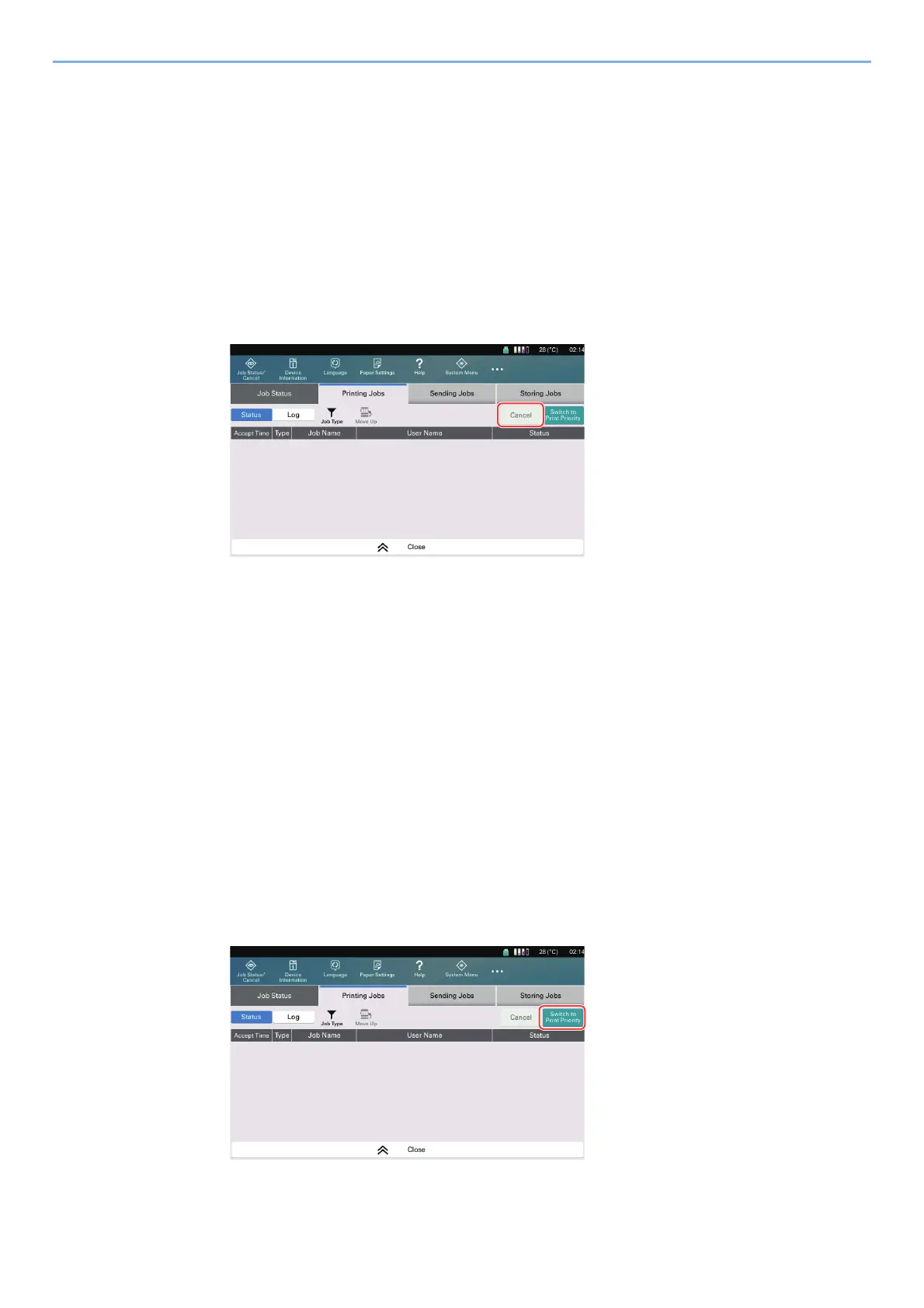 This subsection describes an example of switching the job being printed to the [Print] mode.