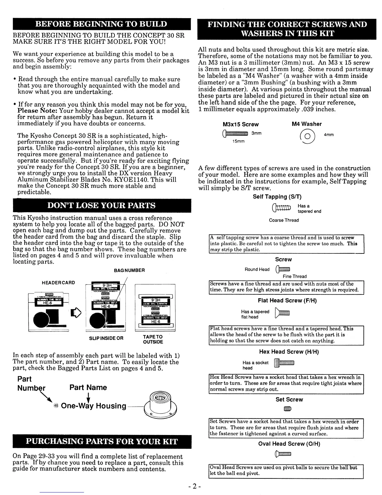 Kyosho Concept 30 SR - Before Beginning to Build; Dont Lose Your Parts; Purchasing Parts for Your Kit; Finding the Correct Screws and Washers in this Kit