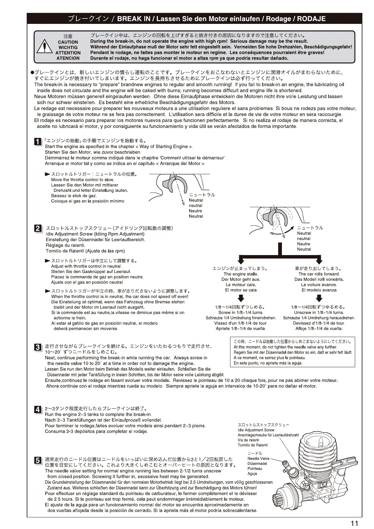 Kyosho DBX - Engine Break-In Procedure; Initial Engine Start for Break-In; Idle Speed Setting During Break-In; Running Adjustments for Break-In
