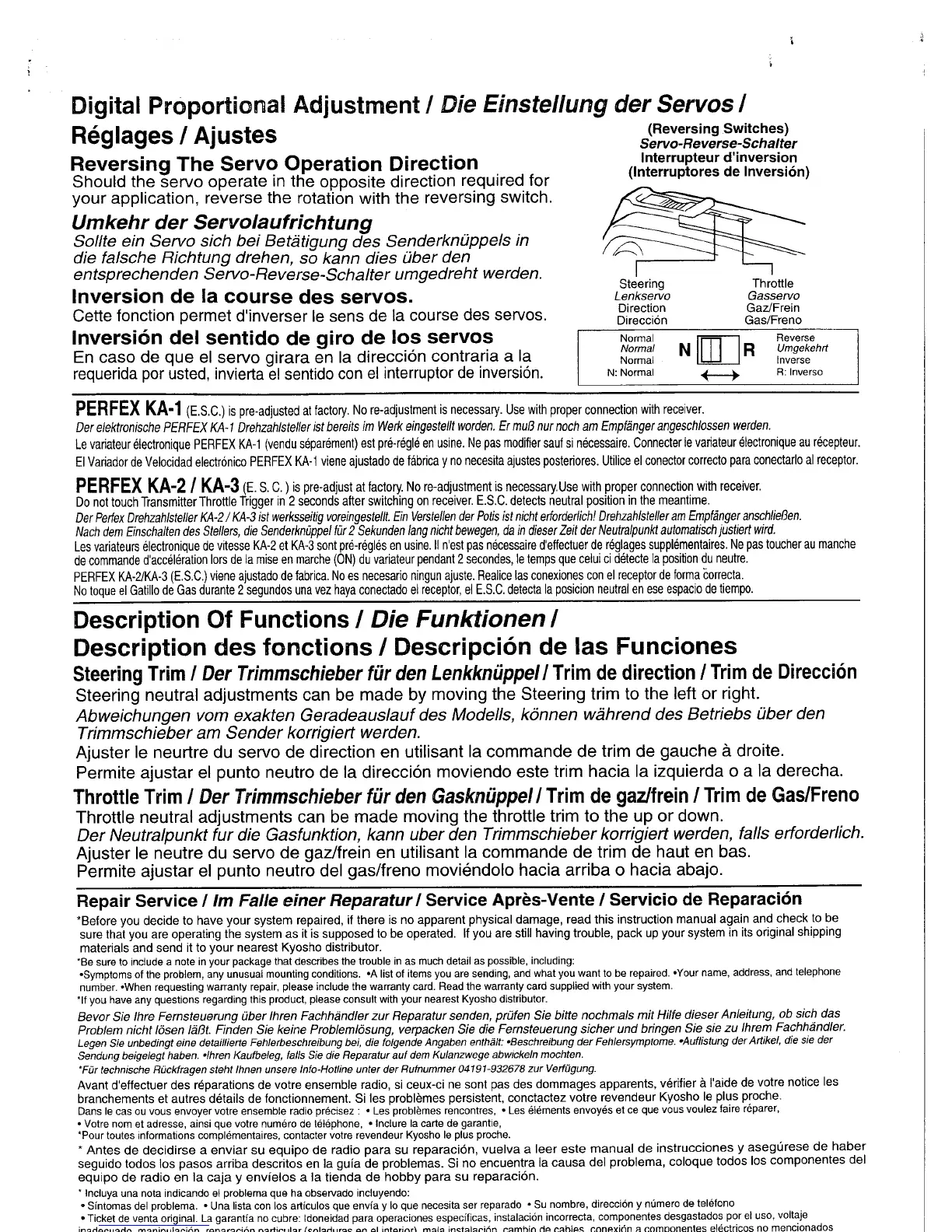 Kyosho Perflex - Servo Adjustments and Repair Service; Servo Operation Direction Reversal; ESC Adjustment and Function Description; Repair Service Procedures
