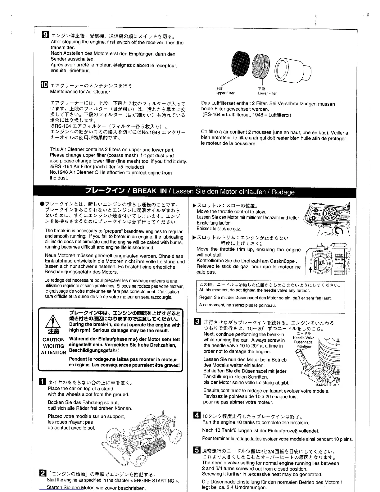 Kyosho Perflex - Post-Start Procedures and Air Cleaner Maintenance; Transmitter and Receiver Power Down; Air Cleaner Maintenance; Break-in Adjustment Instruction