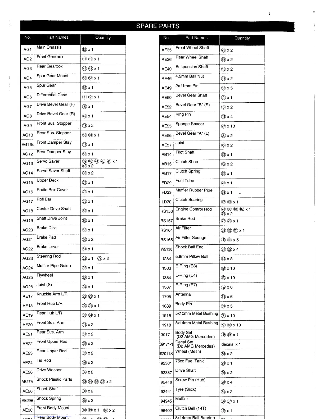 Kyosho Perflex - Spare Parts List; Part Identification and Quantity