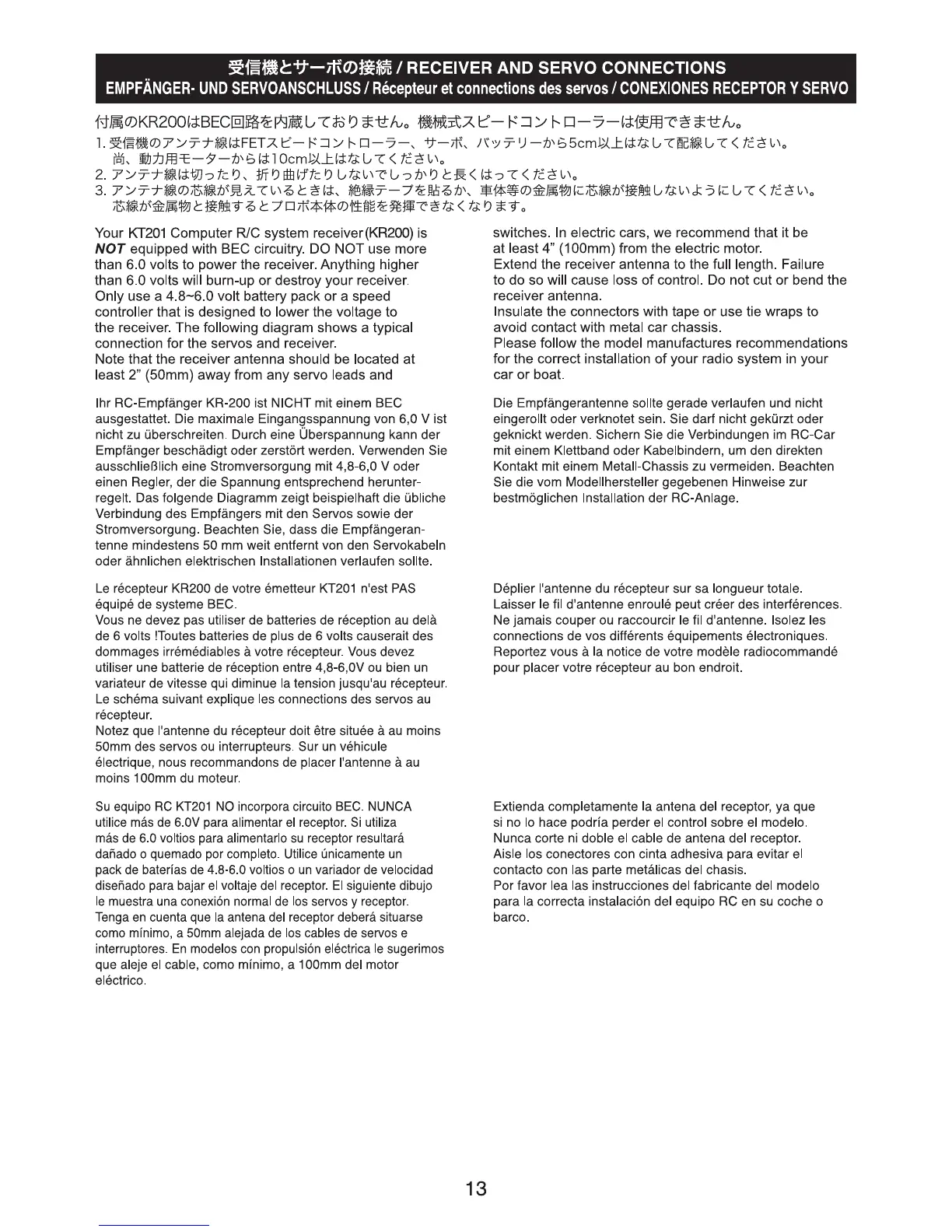 Kyosho Syncro KT-201 - Receiver and Servo Connections; Connection Guidelines and Precautions