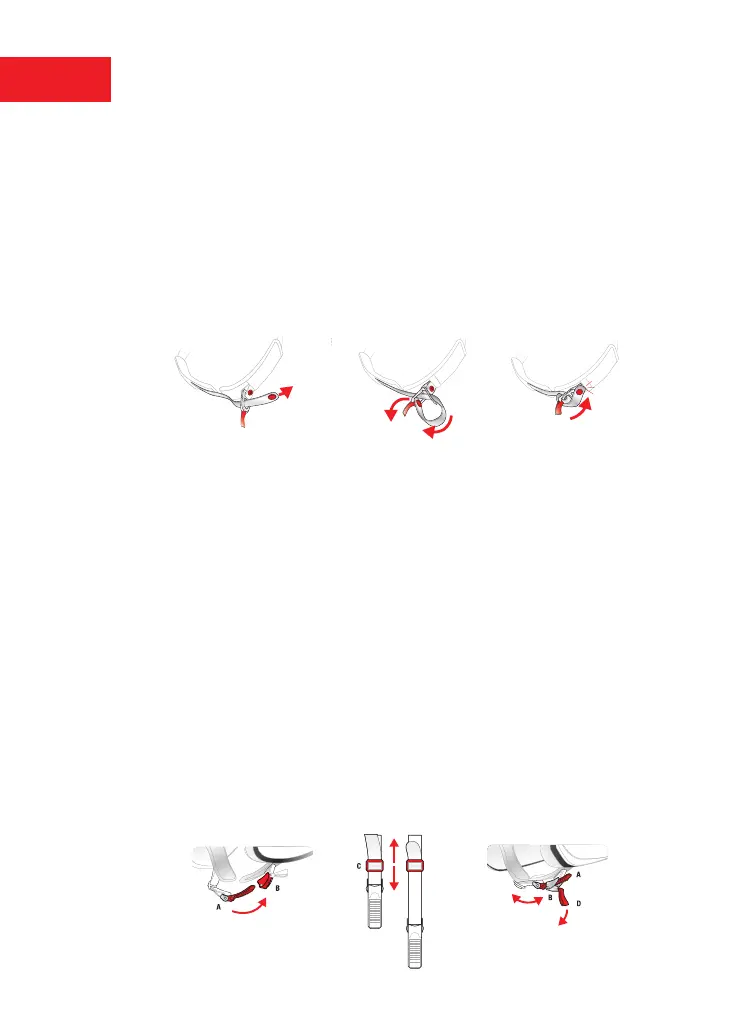 la longitud de la correa deslizando la cinta por la hebilla (C). Repita la operación hasta que consiga