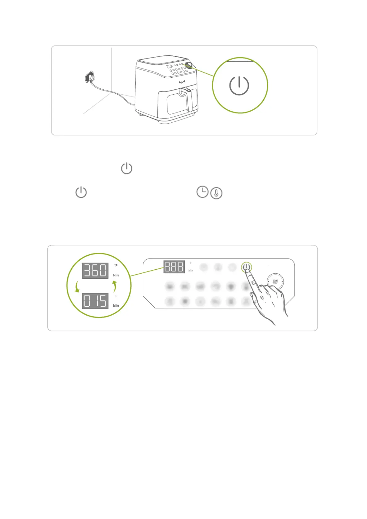 2. lépés: Nyomja meg a gombot a légsütő bekapcsolásához.